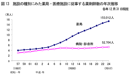 薬剤師全体の人口数の半分以上153000人以上は薬局に従事しており、これは前回よりも7000人以上も増加しています。